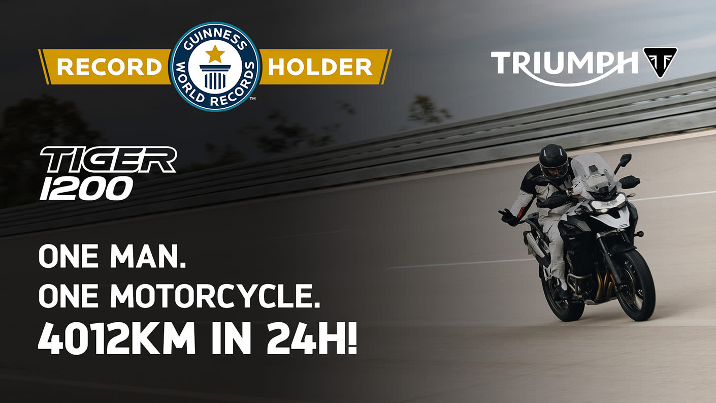 Riding a Tiger 1200 GT Explorer on the High-Speed Ring at the Nardò Technical Center in Italy, Iván travelled more than 2493mi (4012km) in a 24-hour period, beating the previous record of 2116.39mi (3406km) by a huge margin of more than 372.82mi (600km).